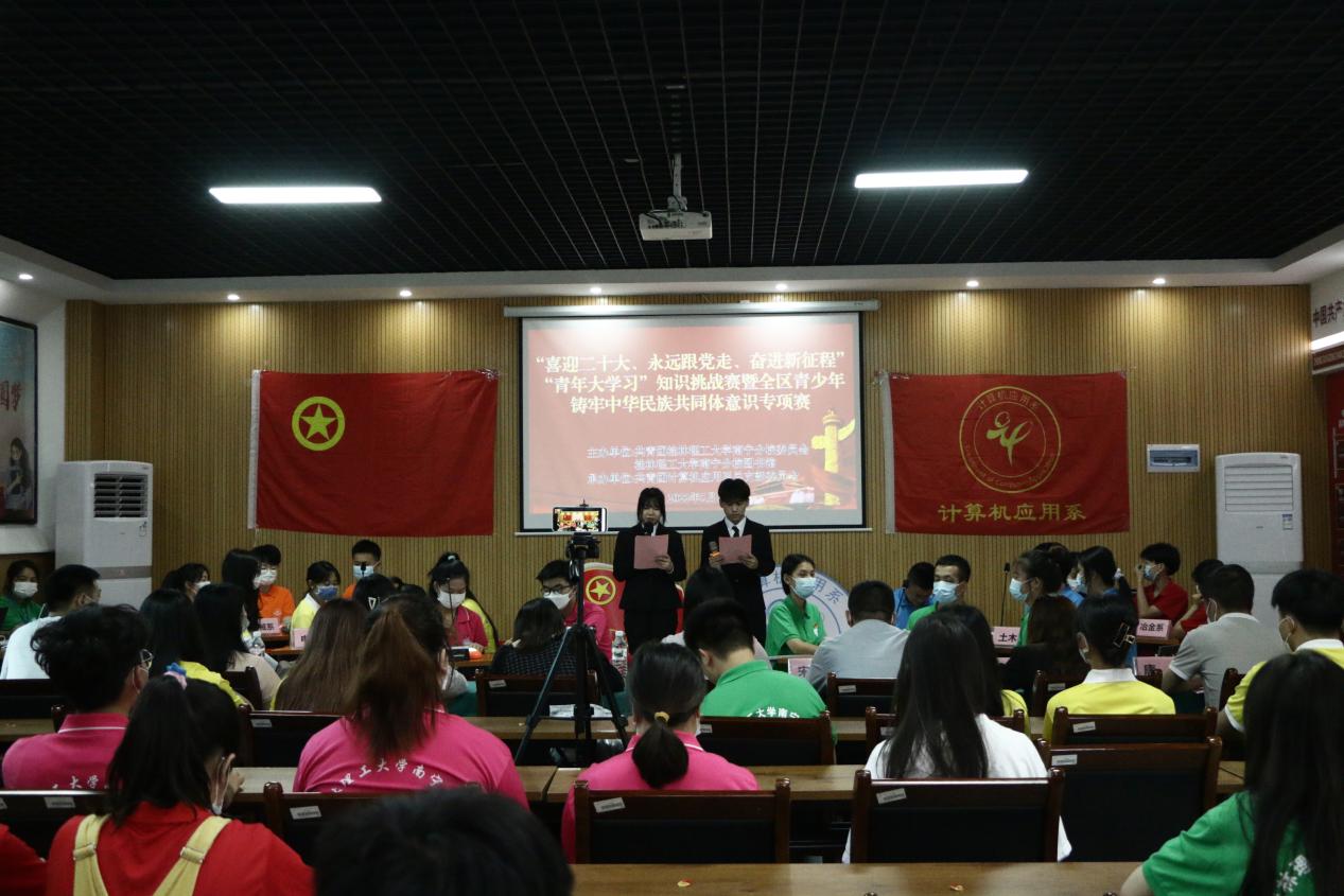 为深入贯彻落实习近平新时代中国特色社会主义思想,贯彻落实习近平总书记关于加强和改进民族工作的重要思想,深化党史学习教育成果,团结引领广大青年铸牢中华民族共同体意识,永远跟党走、奋进新征程,以优异成绩迎接党的二十大胜利召开,5月6日下午,由分校团委、图书馆联合主办,计算机应用系团总支承办的 “喜迎党的二十大、永远跟党走、奋进新征程”“青年大学习”知识挑战赛暨全区青少年铸牢中华民族共同体意识专项赛在青马书屋举行。分校团委副书记谢欢老师、分校图书馆黄春露老师以及六系辅导员、学生代表等80人参加本次知识竞赛。