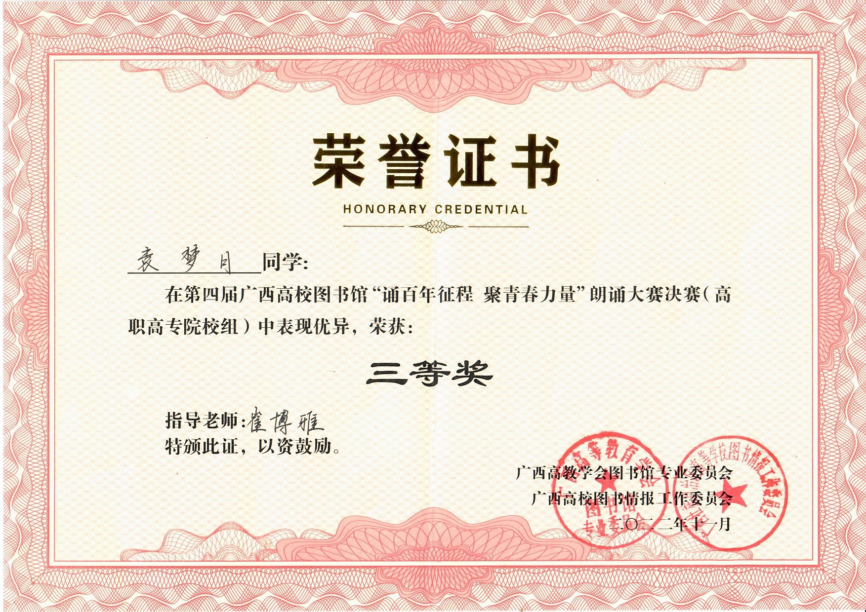 决赛现场,专家评委从朗诵内容、仪表形象、朗诵技巧、作品表达、舞台表现、氛围效果等方面进行综合打分,并在比赛结束后对选手表现进行点评总结。我校会展20-本3班袁梦月同学的朗诵作品《祖国发展我成长,我与祖国共奋进》荣获大赛三等奖,崔博雅老师获得指导老师奖。
