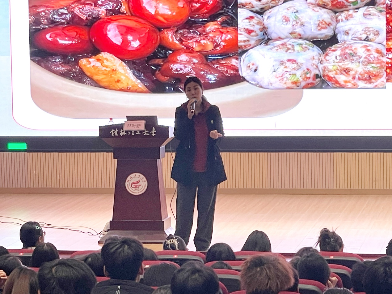讲座中,林叶新副教授从广西“八山一水一分田”的独特地理格局切入,结合亚热带季风气候特征,以桂林米粉、柳州螺蛳粉两大“粉界王牌”为引,生动解析地理环境对本地食材选择与风味体系的深刻影响,从桂菜“鲜、香、酸、辣”核心风味拆解,到油茶制作、梧州龟苓膏等非遗饮食的传承创新,层层递进间让同学们深刻领悟“一方水土养一方粉”的饮食文化内涵,感受地域特色与饮食智慧的交融。林教授寄语同学们做八桂美食文化的传承者与创新者,让桂味飘香更远。在互动环节,同学们踊跃参与,争相回答林教授提出的美食趣味问题,并主动分享自己家乡的独特味道。在轻松融洽的氛围中,大家对广西多元交融的饮食文化有了更深刻的体认。