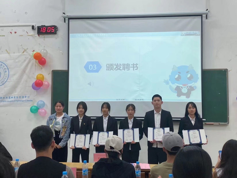 首先,集体观看本届委员录制的视频,表达了他们对本届委员及团体的告别与殷切嘱托。其次,由分校学工部副主任章丰慧老师宣读任职文件,紧接团委书记黄薇薇老师给予本届任职委员颁发聘书。随后,由本届委员贺鹏飞同学代表发言,从就职工作经历、以及所获得的荣誉对校级学生团体工作作了简要的回顾与总结。在本届委员向新一届委员交接了工作牌之后,新一届委员孙楠同学代表发表了就职感想,不仅宣读了在校级学生团体的工作计划,还对这些计划的圆满实施作出了保证,说明了在自己工作设想的同时也表达了自己对其工作顺利完成的决心。最后,由党委副书记唐承泽老师发表总结性讲话,在肯定本届校级团体工作的同时,也对他们致以真诚的感谢。并对新一届委员工作提出了要求,也给予了希望并强调了“师生共同努力,筑梦桂工校园”。并对校级学生团体、老师们取得的优异成绩表示忠心的感谢。