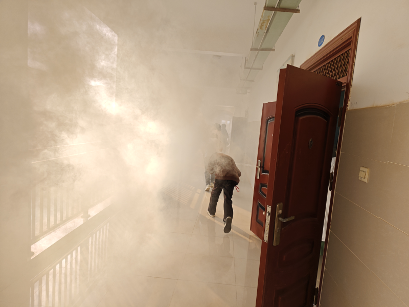 宣讲教育结束后,以实验室同学们正在进行课堂实验过程中突发火情为场景,开展了火情场景应急处置演练。当火势较大,应急警报声响后,学生模拟准确迅速报警,老师们立即引导同学们有序疏散,大家用袖子捂住鼻子和嘴巴、弯腰迅速往楼下疏散……整个演练活动紧张而有序。
