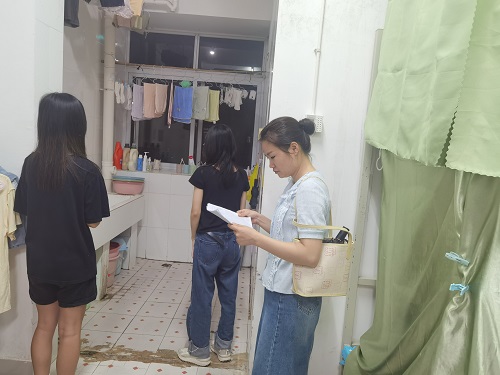 党总支副书记兼学工组长方艳带领辅导员对学生宿舍的内务卫生及安全隐患进行了大检查,对检查发现的物品摆放较乱、宿舍卫生不及时清扫督促学生整改,并提醒学生遵守宿舍管理规定,提高消防安全意识,同学之间和谐相处。