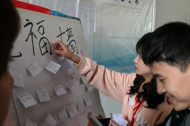 同学们在祝福墙上给女老师们写祝福