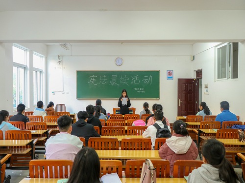 七点五十,我系2019级各班学习委员在自习室带领全体同学共同朗读宪法条例,让广大同学在潜移默化中熟悉宪法、认识宪法,弘扬法治精神、强化法治理念,切实提升了宪法教育的针对性和实效性。