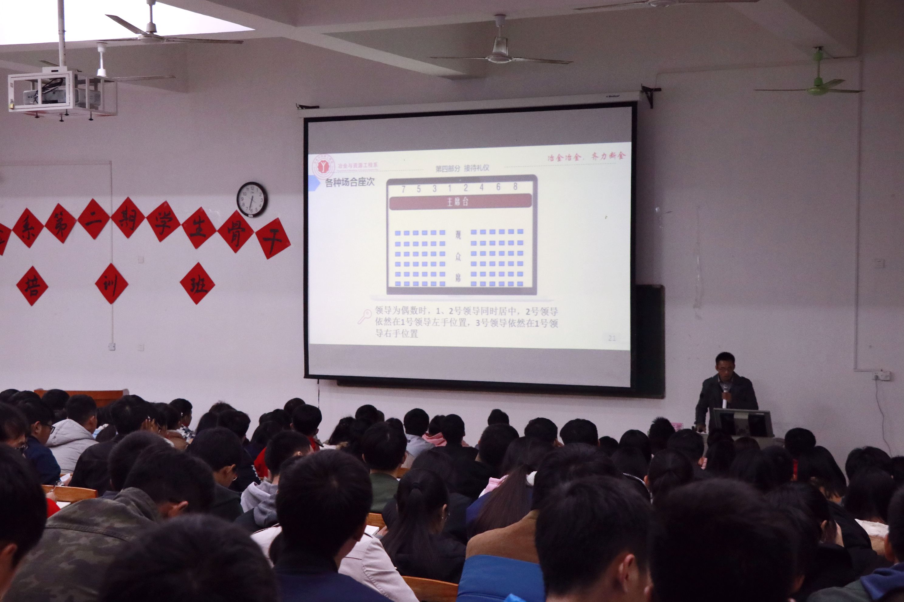 随后,我系党总支副书记兼学工组组长黄运堪老师上台进行第一讲培训——大学生文明礼仪与日常行为规范。课上,黄老师首先从礼仪的作用方面作为切入点向同学们进行详细讲解。并在课上让同学们进行情景模拟,身临其境地体会其中的要义与内涵。着重强调了关于握手礼仪、个人礼仪、日常人际交往礼仪与接待礼仪等几个方面的内容。最后,就校园礼仪特别是课堂礼仪、办公场所礼仪、宿舍礼仪等校园其他礼仪的讲解作为强调并总结。