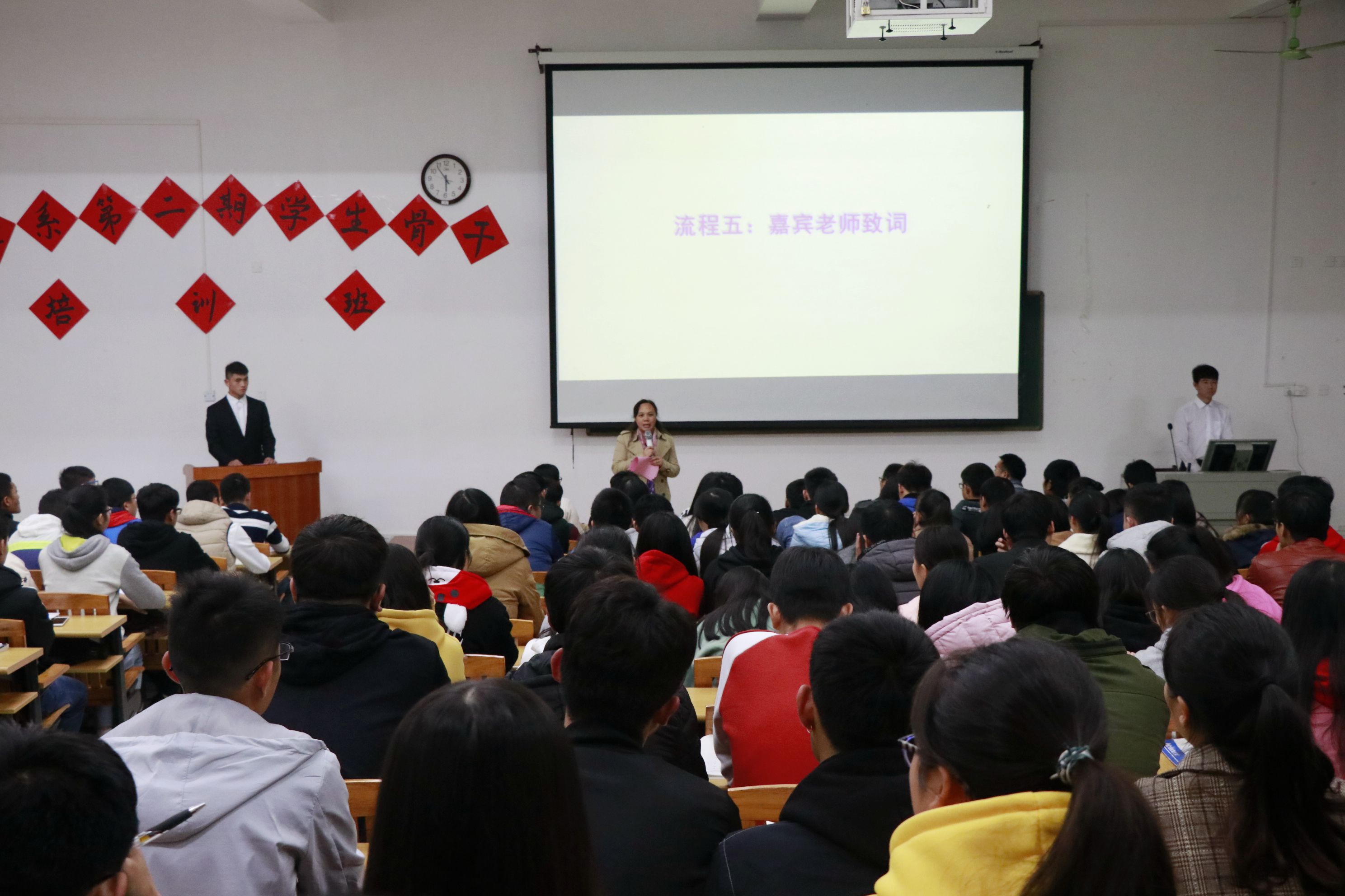 为进一步加强学生骨干队伍建设,提高学生骨干的综合素质,更好地发挥学生骨干核心工作。我系于12月13日下午17:30,在启智楼8401教室开展了我系第二期学生骨干培训班开班典礼暨培训班第一堂课。我系主任何贵香老师、系党总支副书记兼学工组长黄运堪老师、辅导员黄观媛老师、吴祖枝老师出席此次培训班开班典礼,我系2017级各班全体班干、系团总支学生会、新媒体中心、党务中心和心理工作站全体成员共259名学员参与开班典礼及培训。