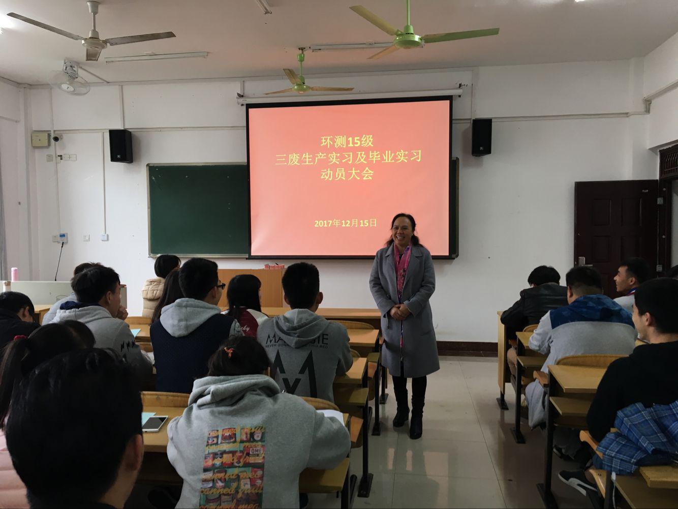 为帮助学生对实习形成正确认识,端正实习态度,强化安全意识,顺利完成实习任务,12月15日下午,环境监测与治理技术专业在践行楼2306教室召开实习动员会。系主任何贵香应邀参加,并作实习动员讲话,环境保护教研室全体教师、辅导员黄观媛老师,以及环境监测与治理技术2015-1、2班全体学生参加了动员会。动员会由教研室主任梁宁主持。