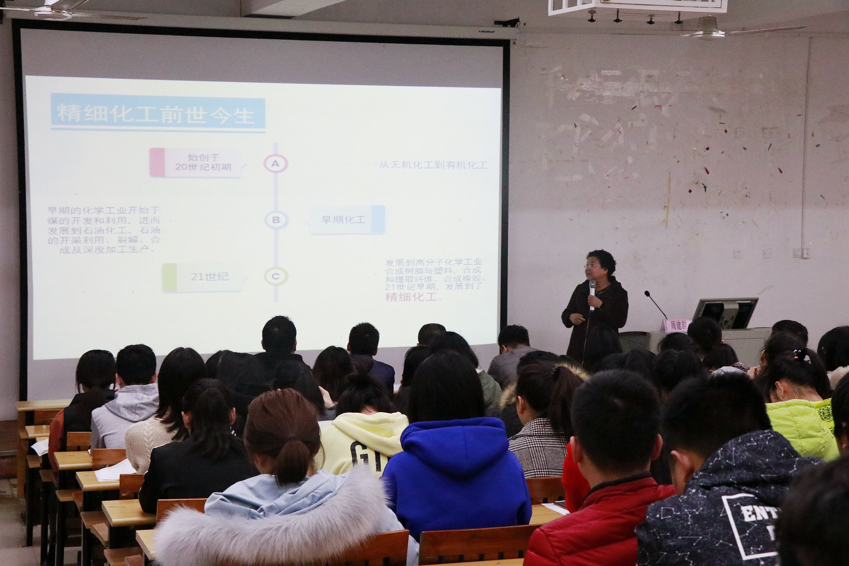 讲座上,周建群高级工程师(教授级)首先详细介绍了精细化工的由来、定义、特点、用途及发展前景等,通过对无机化工和有机化工、传统化工和精细化工进行深入比较,帮助师生全面梳理了精细化工的相关知识,并结合精细化工的发展形势和就业前景帮助同学们树立学习化工专业的信心。周建群高级工程师还紧密结合自身的科研经历,以桉树生长中新型除草剂的研发、饲料有机微量元素添加剂、新一代螯合技术等例子为同学们介绍了化工的广泛用途,说明了精细化工在国民经济发展中所占的重要地位、精细化工的发展趋势及化工行业对专业技术人才的需求等情况。