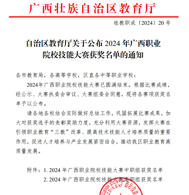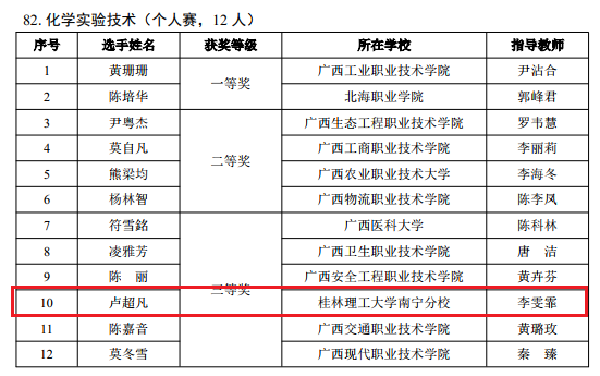 日前,自治区教育厅公布了2024年广西职业院校技能大赛获奖名单,我院获得了4个奖项,其中新材料智能生产与检测、食品安全与质量检测赛项团体三等奖3项,化学实验技术赛项个人三等奖1项。