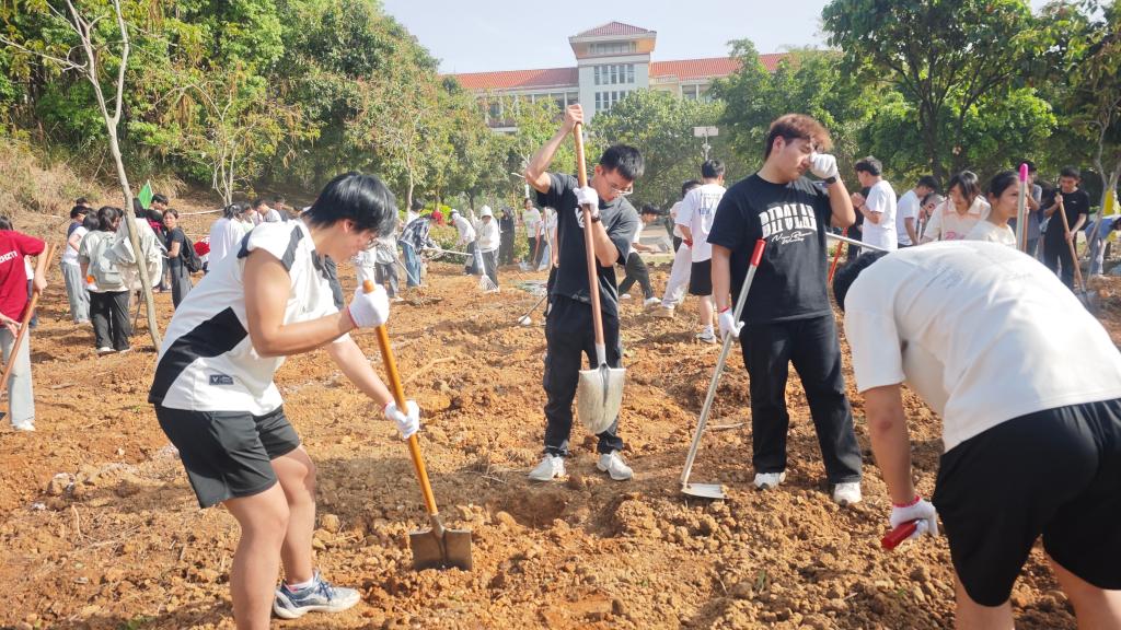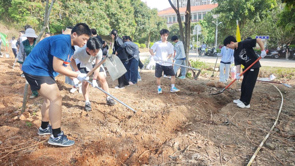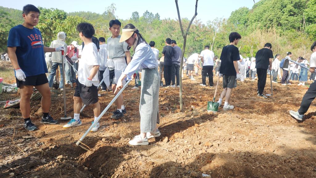 在春意盎然的建设现场,师生们手持劳动工具,有序开展土地平整、杂物清理工作。方艳副书记与学生们共同参与土地整理工作并表示:"要让大家在劳动中体会'一分耕耘一分收获'的道理。希望同学们通过亲身参与,既能学习实践技能,更能培养吃苦耐劳、团结协作的精神品质。"